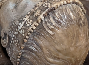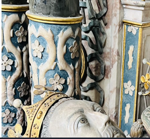 Finally, of interest is the very top of the memorial (below). In Tudor England, placement on funerary memorials was never accidental. It functioned as a visual language that contemporaries could “read,” conveying hierarchy, kinship, and favor. Vertical hierarchy equaled importance, defining the identity and legitimacy of the person(s) commemorated below. In this case, in the center, there appears to be the Leicester cinquefoil that could perhaps also be considered a symbolic abstract Tudor rose, and on top of that, what appears to be a red rosette, its unique placement unmistakable. As if Lettice was stating “here lies a Tudor and Leicester”.
