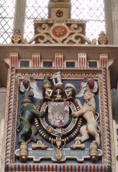 It should be noted that Robert Dudley used the ermine cinquefoil symbol, while the white flowers on the monument clearly are not ermine cinquefoils. Below are examples of Dudley’s use of the ermine cinquefoil, particularly on his shield (below left) in his portrait of 1563 (below right). Of all people, Lettice would have known this fact, and I do not believe Lettice would have left such an important detail out of her meticulous planning of this memorial for her beloved husband.