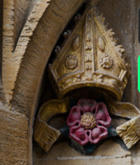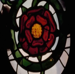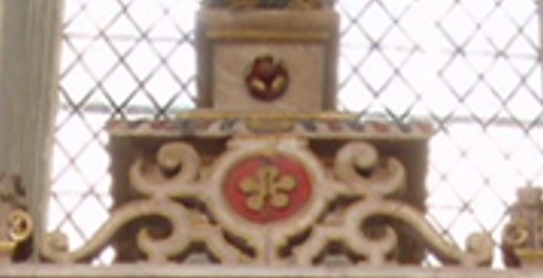 Another fascinating display is the red rose of Lancaster again, although this time crafted as part of the iron enclosure in front of Lettice and Dudley’s tomb (below far left and far right). These red roses are numerously displayed on the enclosure, each fashioned with five red petals, green barbs, and gold seeds in the center. It is impossible not to see the allegory here linked to other traditional symbols of the red rose of Lancaster (below second and third from the left).